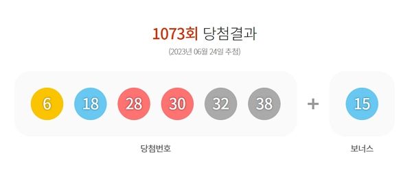 24일 동행복권은 1073회 로또 당첨번호가 '6·18·28·30·32·38'번이라고 밝혔다. 보너스 번호는 15번이다. 이번 추첨에서 당첨번호 6개를 모두 맞힌 1등 당첨자는 11명으로, 각각 23억4523만원씩 받는다. 로또 1등 당첨지역은 인터넷 복권판매사이트 1곳, 서울 1곳, 대구 1곳, 인천 2곳, 광주 1곳, 충북 음성 1곳, 충남 당진 1곳, 충남 서천 1곳, 충남 아산 1곳, 경남 창원 1곳이다.