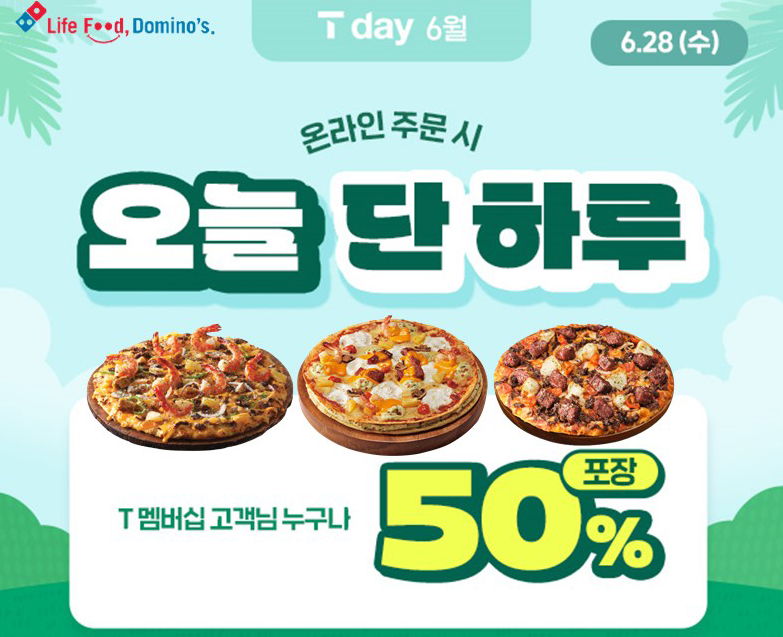 배달 피자 브랜드 도미노피자가 내일 하루동안 SK텔레콤 고객에게 특별한 혜택을 제공하는 'SKT T day' 프로모션을 개최합니다. 이 프로모션은 SK텔레콤 고객을 대상으로 방문 포장 시 50% 할인 또는 적립 혜택을 제공하며, 온라인 방문 포장 주문 시 일정 주문 금액 범위 내에서만 혜택을 받을 수 있습니다. 자세한 사항은 도미노피자 홈페이지를 참조해주세요.