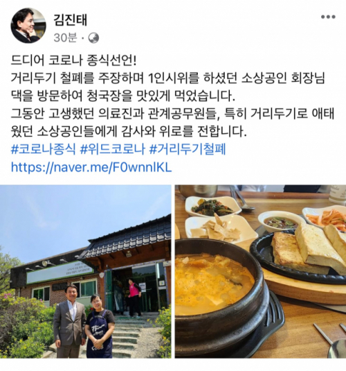 특히 김진태 강원도지사는 비상사태 종식 선언 첫날인 이날 비서실 직원들과 함께 춘천시 동산면의 한 청국장집을 찾았다. 이 식당은 코로나19 대유행이던 2021년 9월8일 밤 11시께 도청 앞에서 '거리두기 철폐' 1인 시위를 벌여 본보에 소개됐던 김은주씨가 운영하는 곳이다.