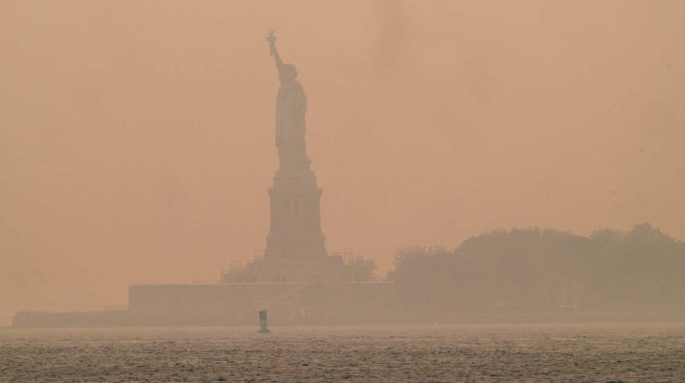 7일 뉴욕 자유의 여신상이 짙은 산불 연기에 휩싸여 있다. 전날부터 미국 동북부 대도시들을 본격적으로 덮친 산불 연기로 7일 뉴욕은 1999년 측정 시작 이래 최악의 대기질을 기록했다. 약 1억명이 사는 미국 동북부 지역에 대기질 경보가 내려졌으며, 상당수 지역에 ‘건강에 해롭다’는 뜻의 적색경보가 내려졌다. 인도 뉴델리 등 최악의 대기질을 기록해온 도시들을 제치고 세계에서 대기질이 가장 안 좋은 도시가 됐다.