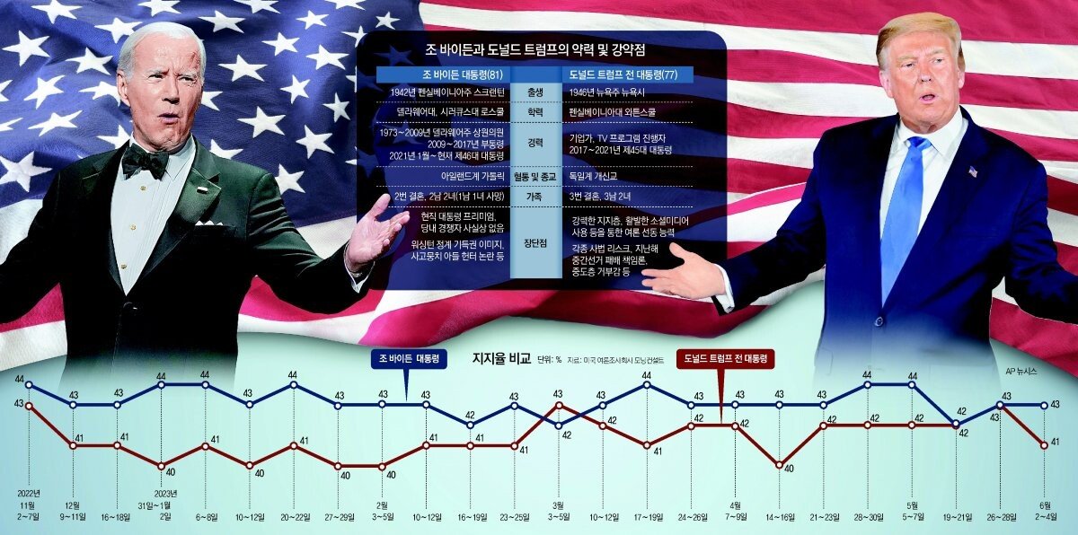 여론조사에서는 두 사람 모두 확실한 우위를 점하지 못했다. 여론조사기업 모닝컨설트가 9∼11일 실시한 조사에서 둘의 지지율은 42%로 같았다. 트럼프 전 대통령이 재선 도전을 선언한 지난해 11월부터 이달 초까지 약 반 년간 매주 발표한 둘의 지지율 조사에서도 두 사람 모두 40%대 초반의 지지율에 갇혀 있다.