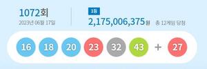 17일 추첨한 1072회 로또 1등 당첨 번호는 '16·18·20·23·32·43'로 결정됐다. 보너스 번호는 '27'다.
